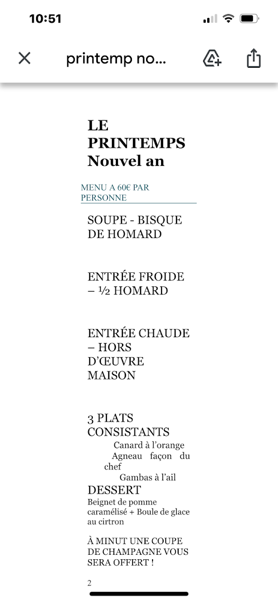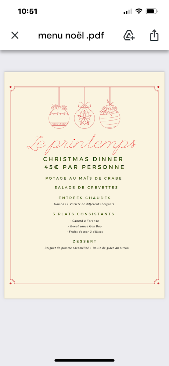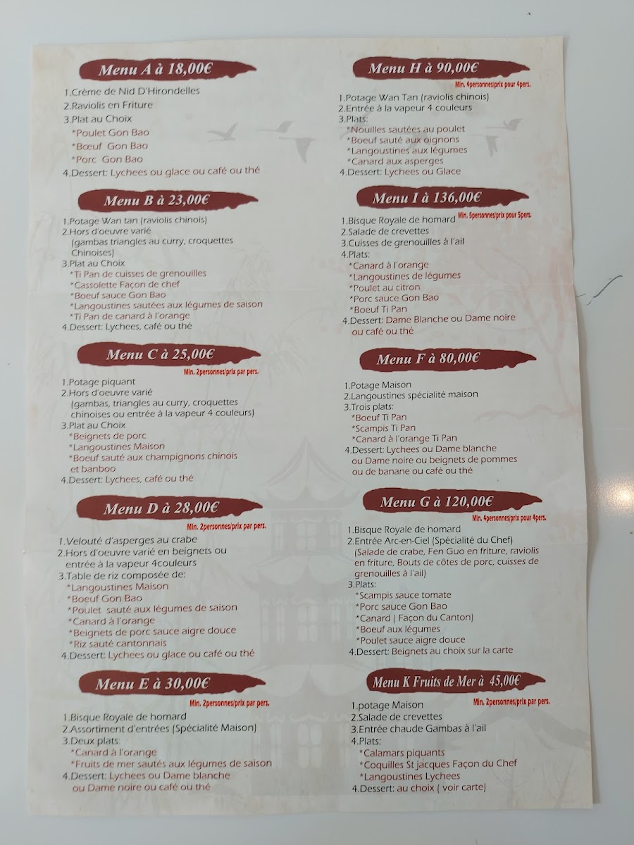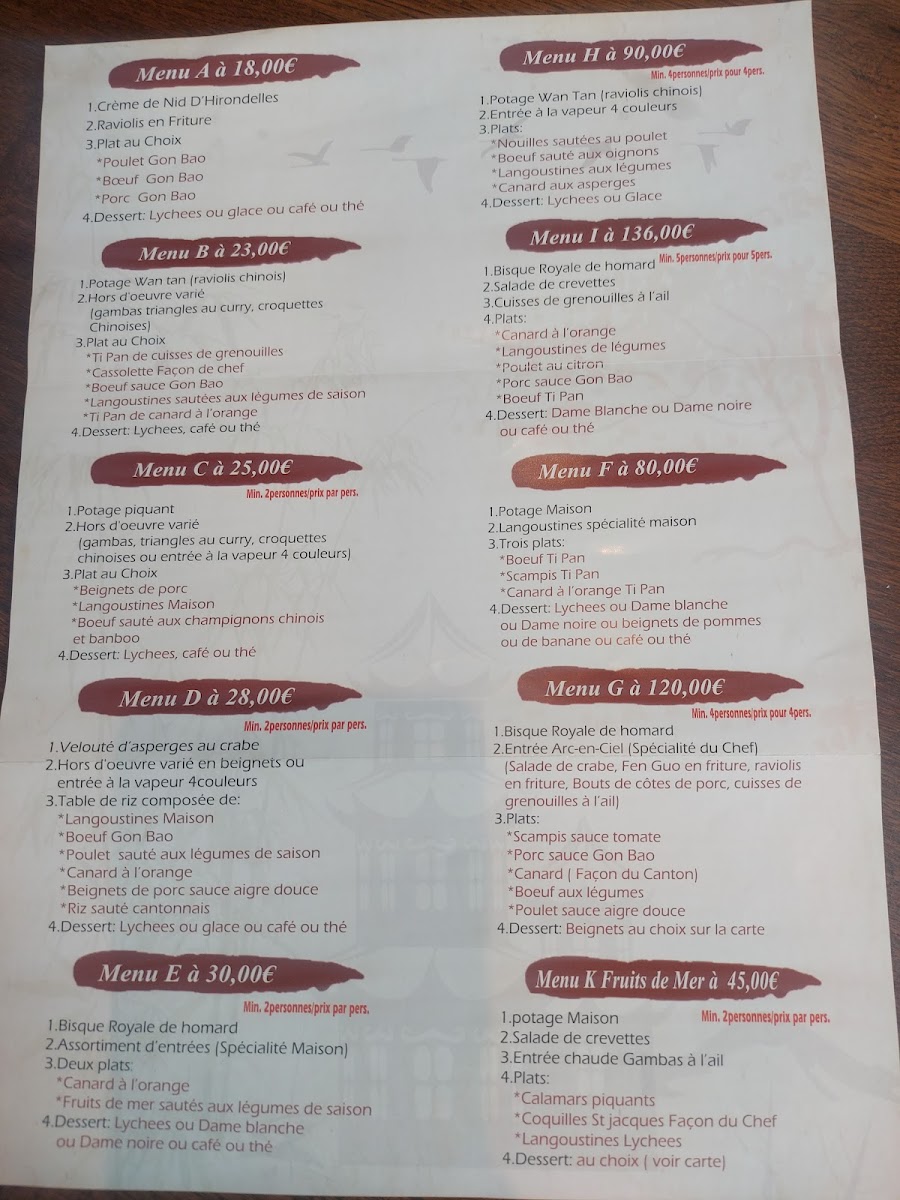 Restaurant Le Printemps offers a delightful selection of French and Belgian-inspired dishes that blend classic flavors with seasonal ingredients. The menu boasts a variety of appetizers, such as the Hors d'oeuvre Varié, a beautifully arranged platter of assorted appetizers perfect for starting the meal on a high note. For those seeking something hearty, the Poulet Aux Légumes de Saison is a standout, featuring tender chicken paired with seasonal vegetables, creating a comforting and fresh dish. Another notable option is the Poulet Aux Champignons Chinois Et Bambous, where the rich flavors of chicken are combined with Chinese mushrooms and bamboo, offering a deliciously unique twist. A true highlight is the Canard Laqué, a succulent lacquered duck that is both crispy and tender, showcasing the chef’s skill in perfecting this French classic. The well-curated menu at Restaurant Le Printemps ensures that every dish, from the appetizers to the main courses, is thoughtfully prepared and full of flavor, making it a wonderful dining experience.